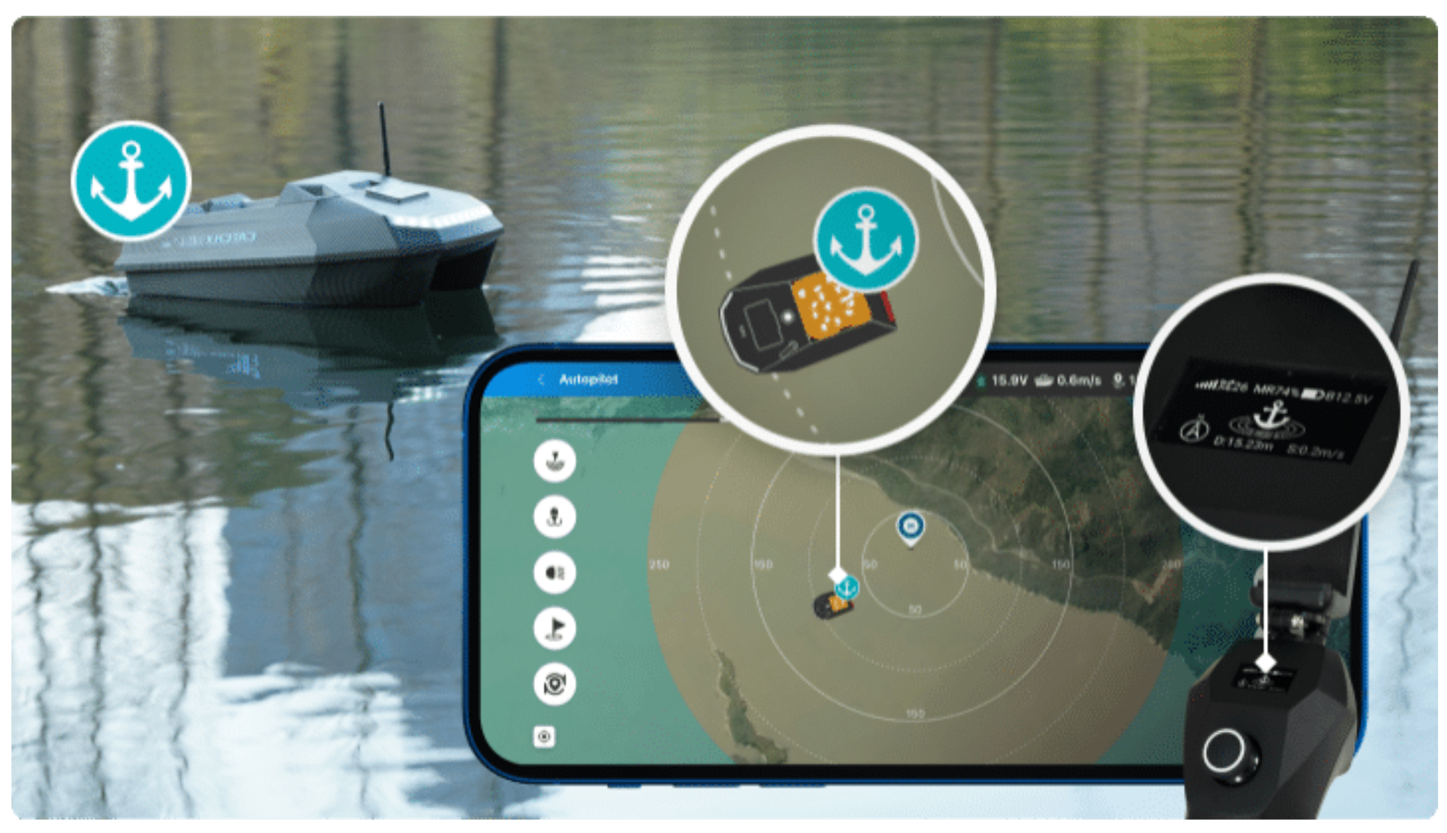 - Elektronická kotva: Automatické udržiavanie polohy po dokončení úloh pomocou duálnych tichých motorov pre presné držanie miesta aj v náročných vodách.